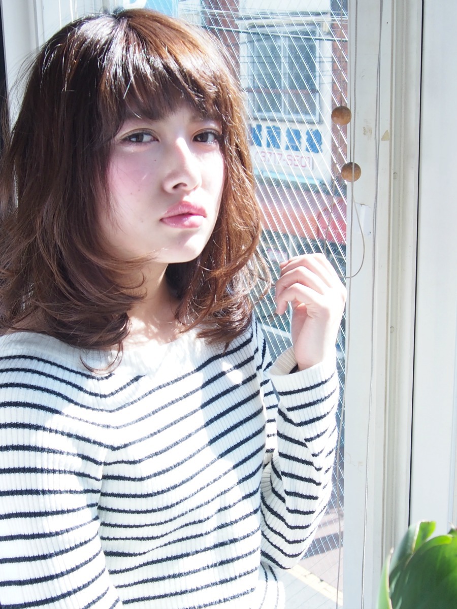 シンプルなミディアムをベースに軽やかな動きがでるようにレイヤーが入ってます☆前髪もカジュアルにも大人っぽい雰囲気にも合わせられる長さ、形にしていますのでどなたにも挑戦しやすいです!カラーは光に当たって透けるようなクリアなベージュでオススメ♪